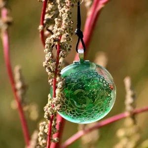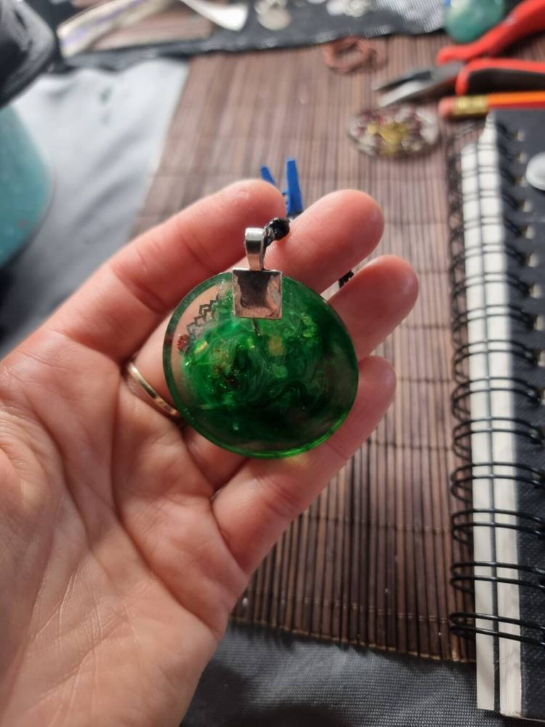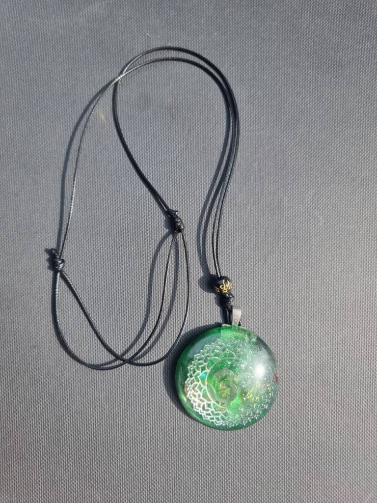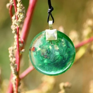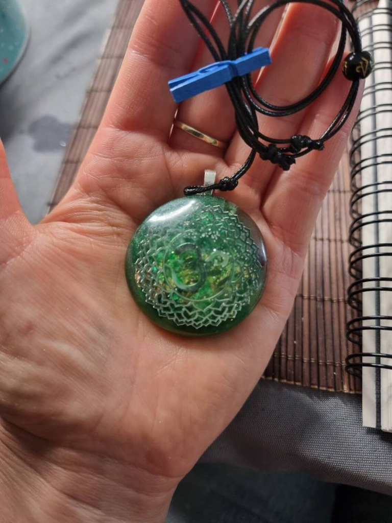 Handgegossener Anhänger aus Resinharz mit dem Om-Symbol und innerem Weihrauchharz sowie Aventurinsteinchen. Zudem ist eine buddhistische Perle enthalten. Der Anhänger hat einen Durchmesser von ca. 4,2 cm. Er ist energetisch aufgeladen und hat einen verstellbares Band.