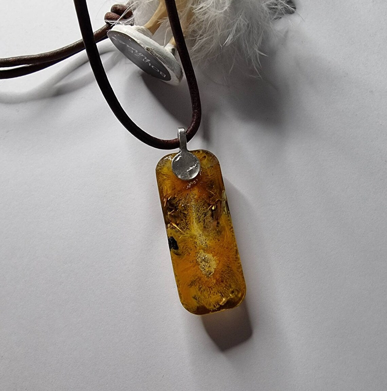 Handgefertigte Kette mit Engelsflügel-Orgonit. In die Kette wurden kleine zusätzliche Harzflocken, Zedernholz, kleine Lavendelblütenstücke, sowie Messing, Kupfer und Bronze verarbeitet. Außerdem enthält sie Bergkristall, Amethyst, Aventurin und Heilsteinsplitter. Die Maße des Anhängers betragen 6 cm x 2 cm und er wiegt 22 g. Die Kette ist mit einem dunkelbraunen, verstellbaren Lederband versehen.