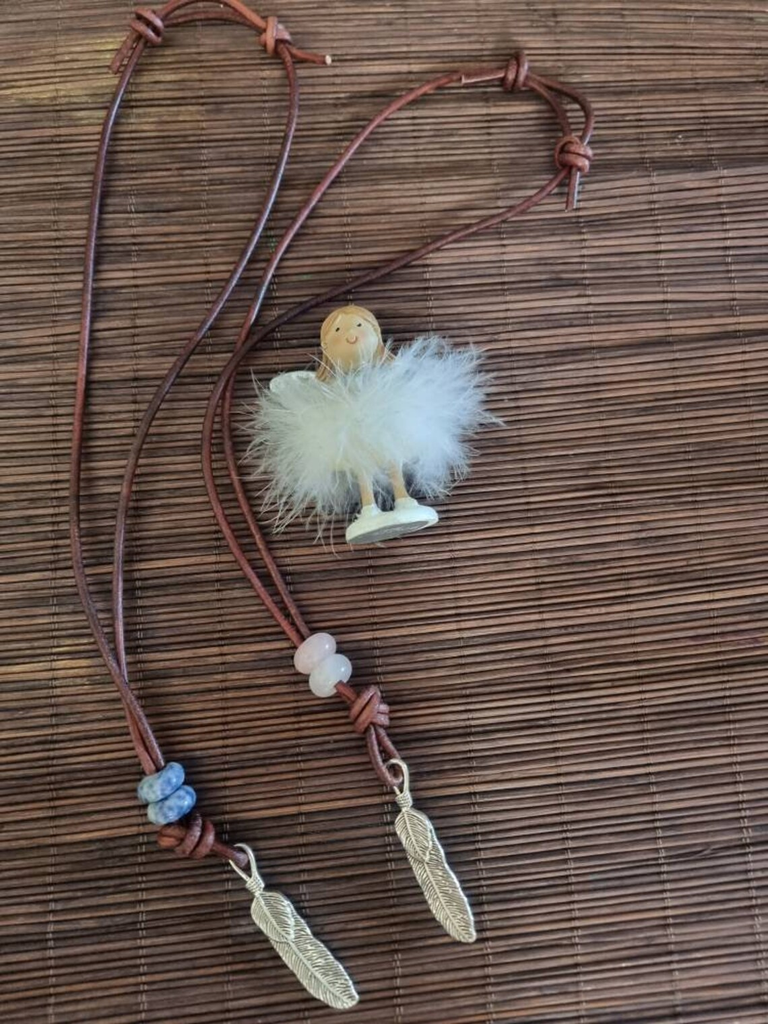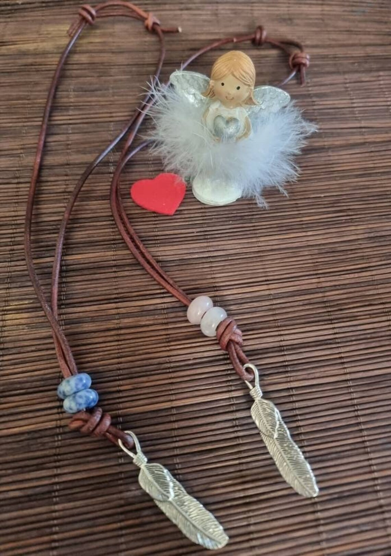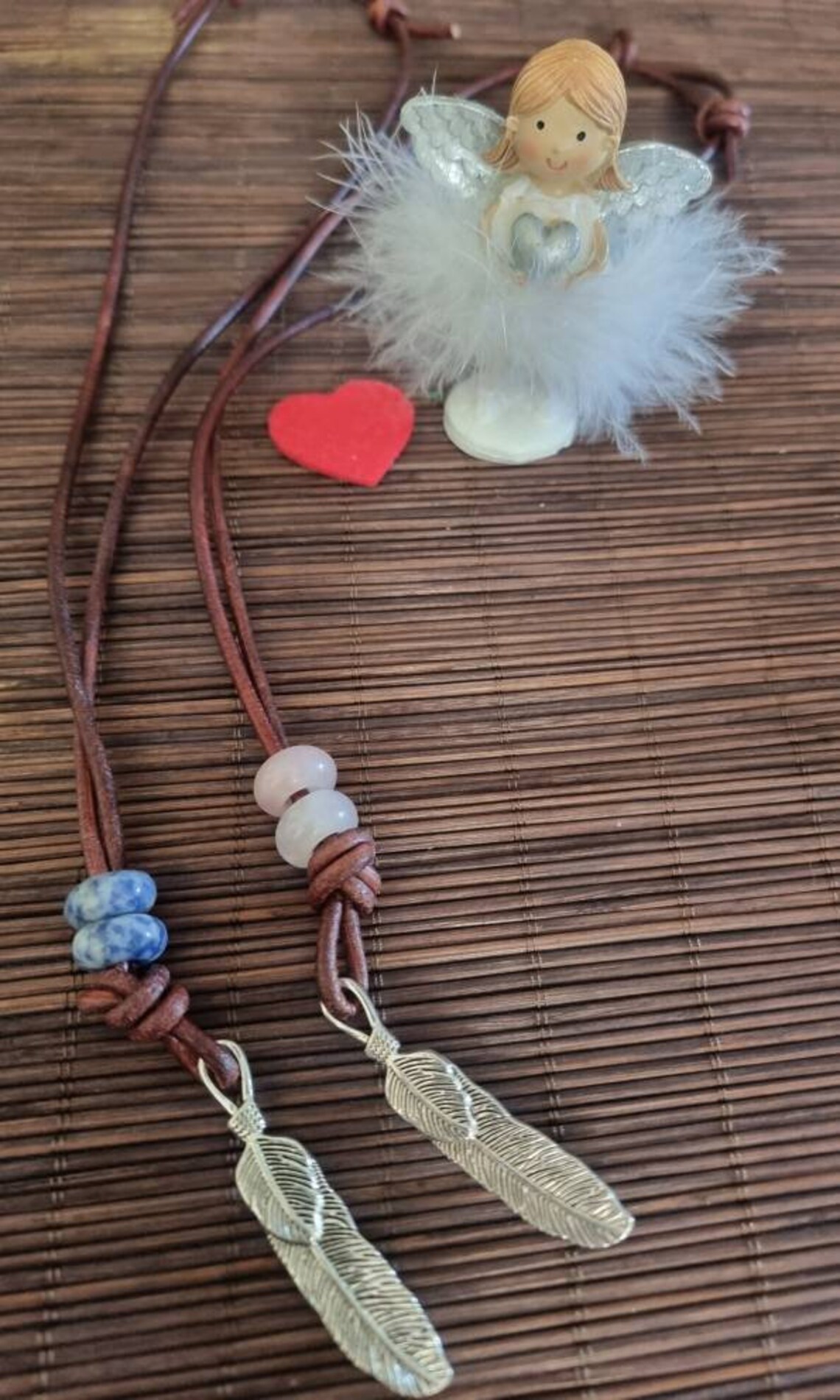 Ketten mit einer 5,5 cm großen Feder und dickem echtem Lederband. Eine ist mit Sodalith-Heilsteinen und die andere mit Rosenquarz verziert.