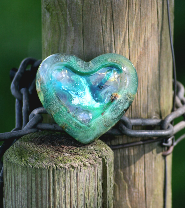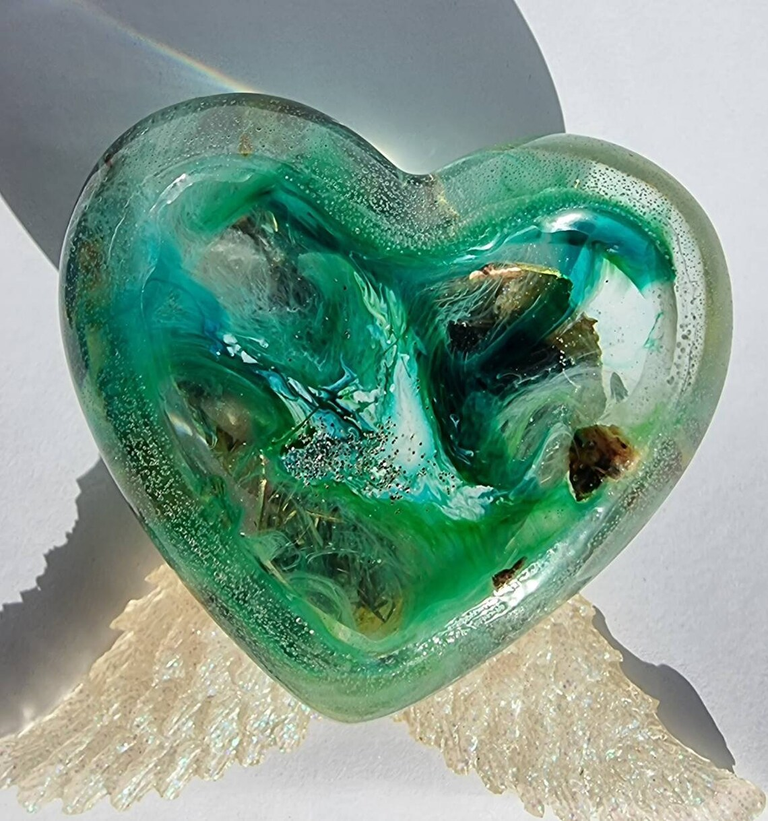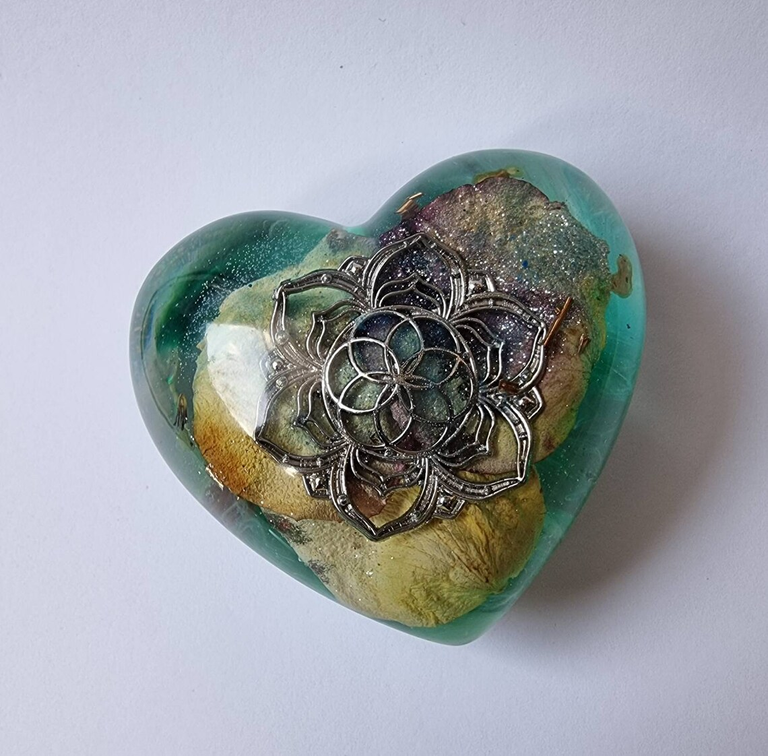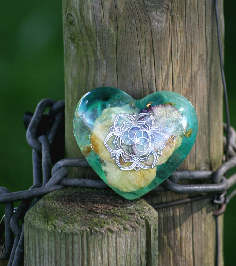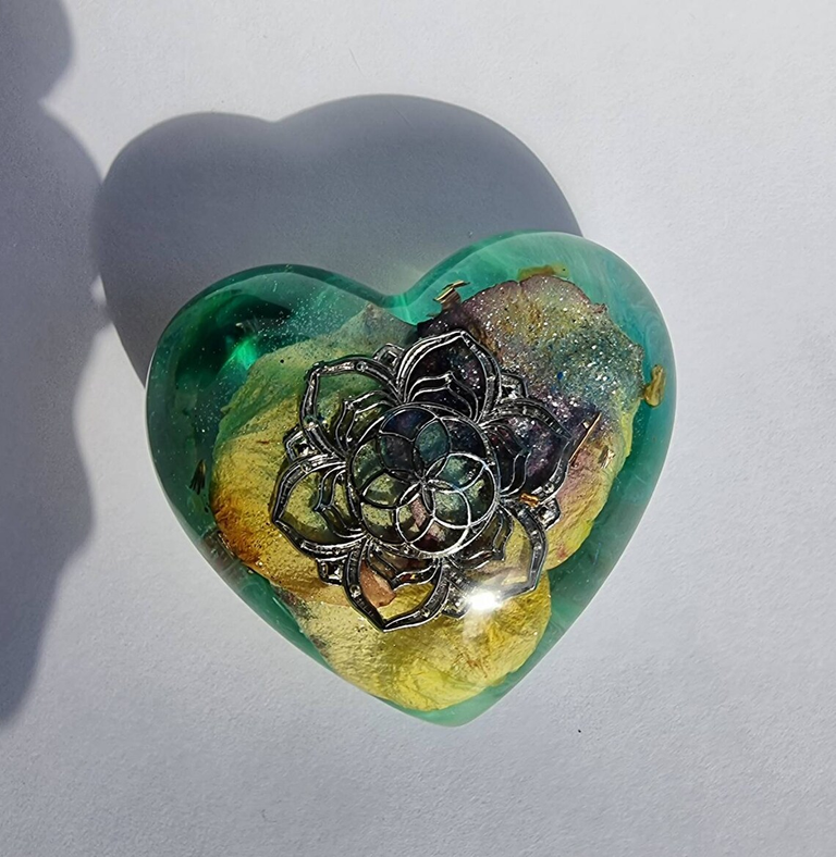 Handgefertigtes Orgonit Herz mit Metall Lebensblume. Kleinere zusätzliche Harz-Flocken, Stücke von Zedernholz sowie Messing, Kupfer und Bronze wurden eingearbeitet. Bergkristall und ein größerer Shungit-Stein sind ebenfalls enthalten, ebenso wie Rosenblätter. Maße: 7 cm x 6 cm.