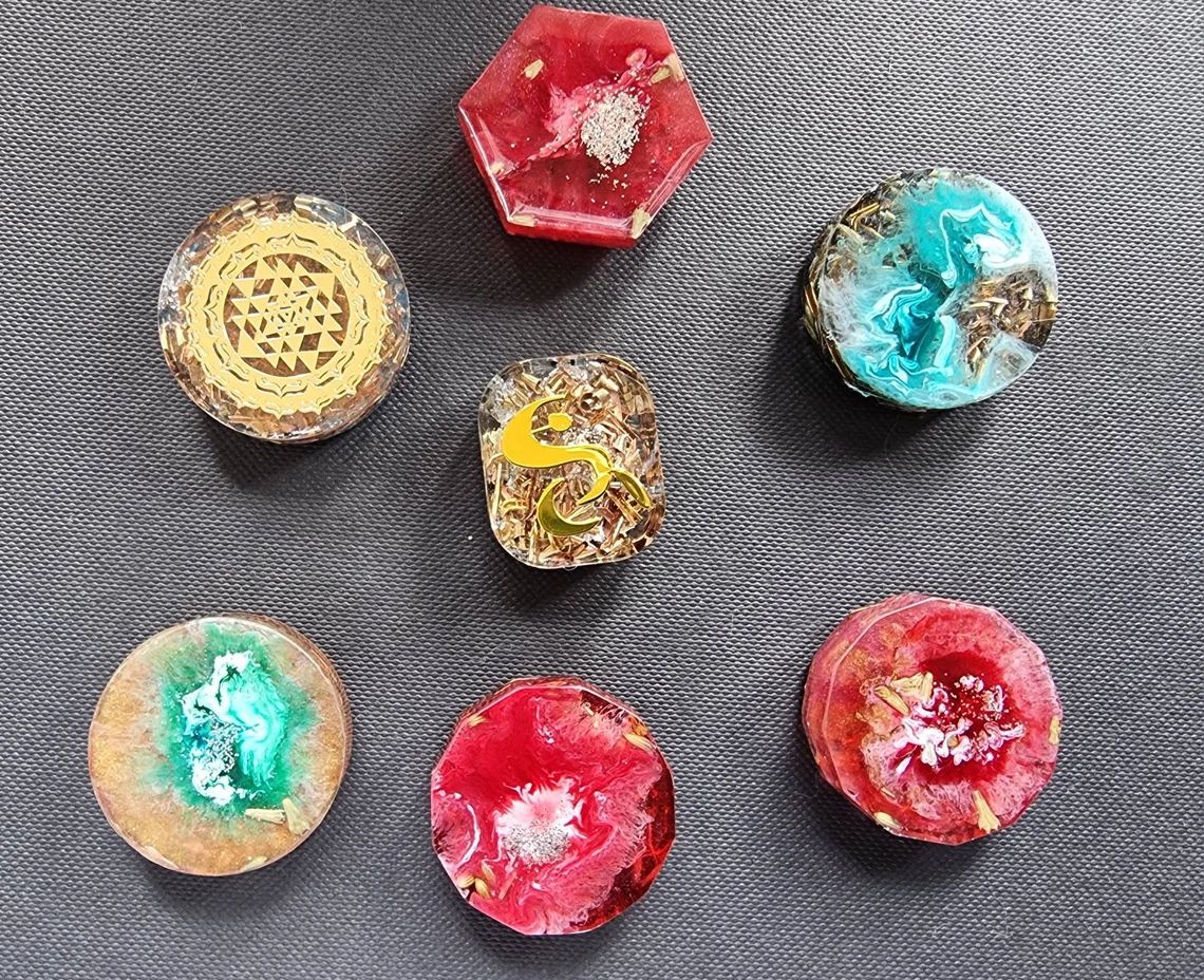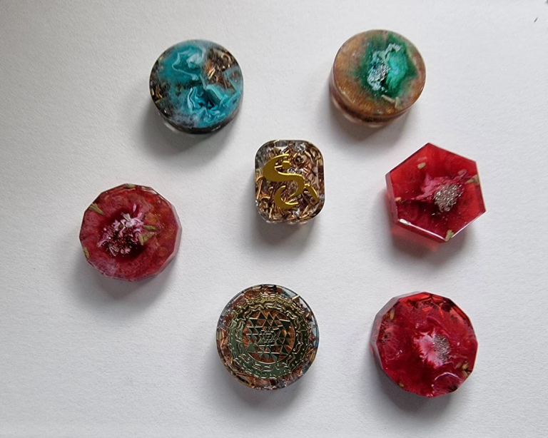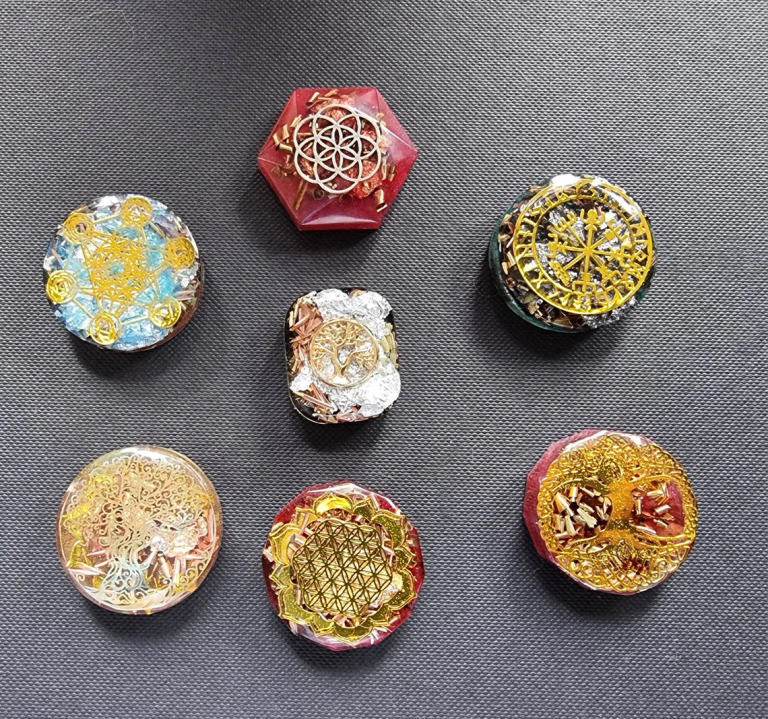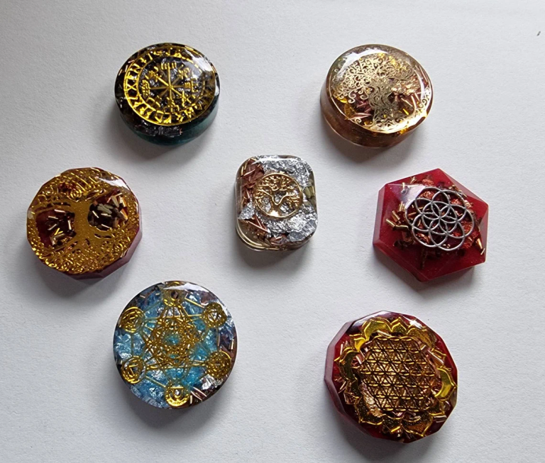 Handgefertigte Orgonite mit verschiedenen Symbolen wie dem Lebensbaum, der Blume des Lebens oder Runen. Sie sind in verschiedenen Farben erhältlich und enthalten kleine Harzflakes, Zedernholzstücke sowie Messing, Kupfer und Bronze. Zudem sind Bergkristall und Granat-Heilsteinsplitter verarbeitet. Die Orgonite haben Abmessungen zwischen 3 cm, 3,5 cm und 4 cm.